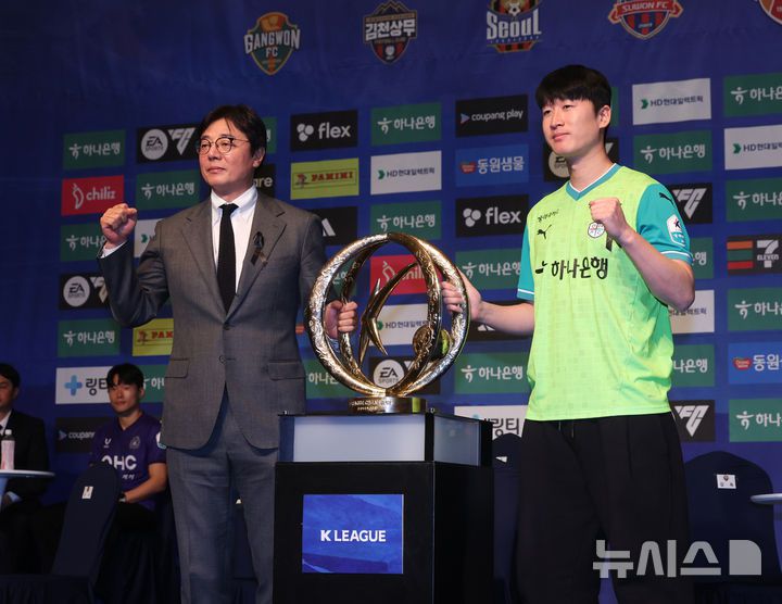 [서울=뉴시스] 김금보 기자 = 지난 2월13일 서울 서대문구 스위스그랜드호텔에서 열린 'K리그1 2025 개막 미디어데이'에서 대전 하나시티즌 황선홍 감독과 이창근이 포즈를 취하고 있다. 2025.02.13. kgb@newsis.com