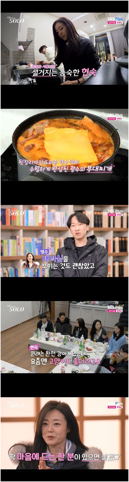 광수는 “장 보고 오느라 늦게 왔는데 내 자리를 마련했더라. 현숙이 내가 부대찌개를 만드는 데 있어 도움을 주려고 하고, 설거지를 하면 옆에서 물을 닦아주고 그러더라. 어쩐지 약간 어떤 감이 있는 거 같다”라며 어떤 어필을 느꼈다. 데프콘은 “약간의 시그널은 맞는데, 착각하면 안 된다”라며 지적했다.