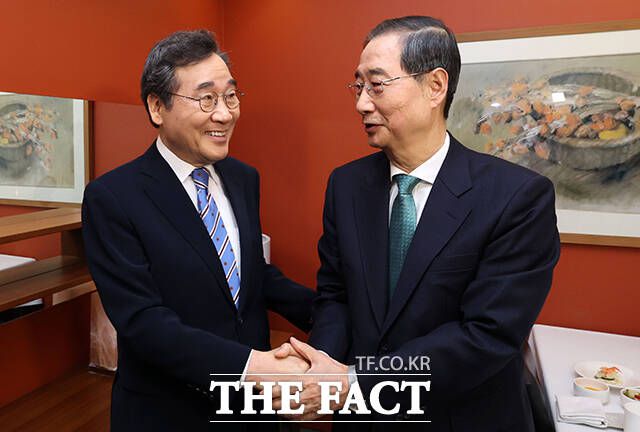 6일 서울 중구 컨퍼런스하우스 달개비에서 한덕수 대선 예비 후보와 이낙연 전 국무총리가 오찬 회동에 참석해 악수하고 있다. /임영무 기자
