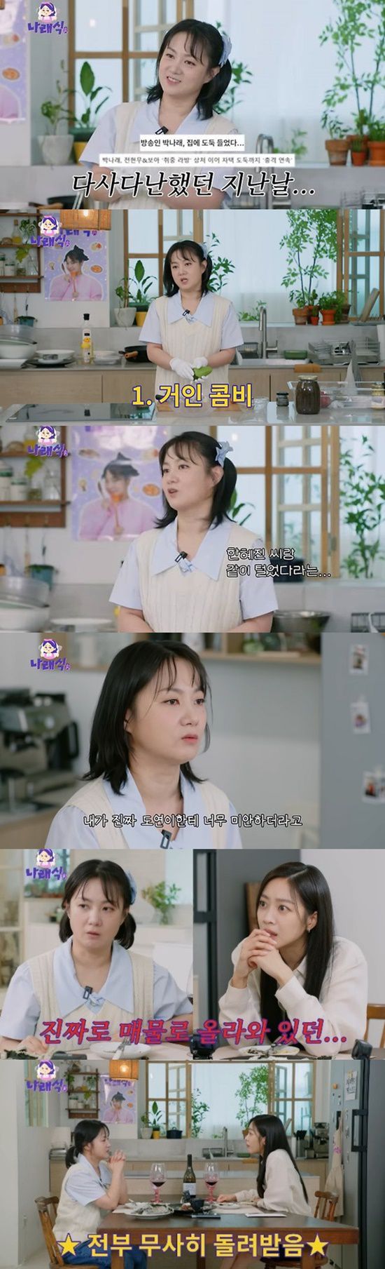 제작진이 자택 도난 사건을 간접적으로 언급하며 "잘 마무리됐냐"고 묻자 박나래는 "잘 마무리됐다. 지난주 금요일 날 잃어버렸던 모든 물건을 흠집 하나 없이 돌려받았다"라고 털어놓았다.