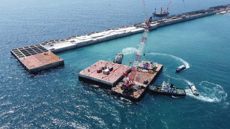 (서울=뉴스1) 황보준엽 기자 = DL이앤씨(375500)는 울릉공항의 마지막 케이슨 설치 작업을 완료했다고 8일 밝혔다. 30함의 케이슨이 모두 설치되면서 공항 활주로의 초석이 완성됐다. 첫 번째 케이슨을 설치한 2022년 5월 이후 약 3년 만이다.