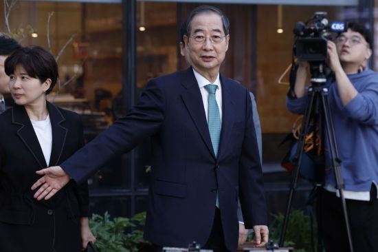 한덕수 무소속 대선 예비후보가 7일 서울 종로구의 한 식당에서 김문수 국민의힘 대선후보와 후보 단일화 관련 회동을 마친 후 식당을 나서고 있다. 2025.5.7 김현민 기자