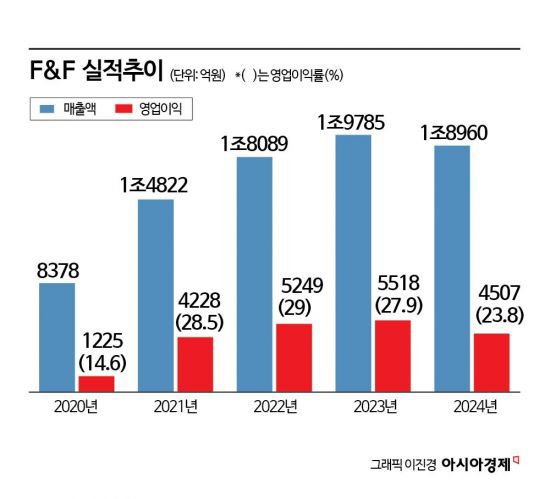 하지만 본진인 F&F 실적은 부진하다. 지난해 내수 부진과 날씨 영향으로 매출액(1조8969억원)과 영업이익(4057억원)이 각각 4%, 18% 줄었다. 올해 1분기에도 F&F는 매출액 5056억원, 영업이익 1236억원을 기록하며 전년 동기 대비 각각 0.3%, 5% 줄었다.