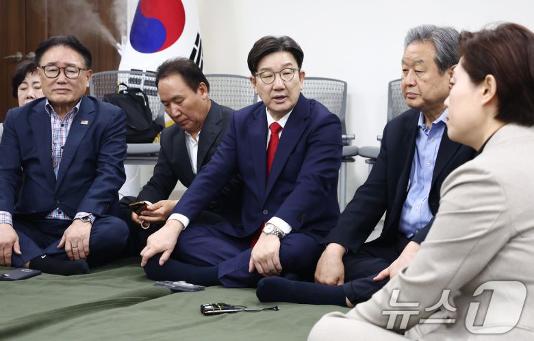 (서울=뉴스1) 김민지 기자 = 김문수 국민의힘 대통령 후보에게 단일화 약속을 촉구하며 무기한 단식에 돌입한 권성동 원내대표가 8일 오전 서울 여의도 중앙당사에서 같은 이유로 단식 농성에 들어간 김무성, 류준상 상임고문을 만나고 있다. 2025.5.8/뉴스1