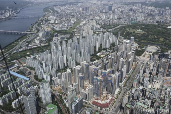 [서울=뉴시스] 김근수 기자 = 7일 서울 송파구 롯데월드타워 스카이전망대에서 잠실 주변 아파트 단지와 재건축 아파트 현장이 보이고 있다. 토지거래허가구역 재지정 이후 재건축 아파트를 중심으로 신고가 행렬이 이어지는 가운데 송파구의 잠실 장미아파트와 주공5단지에서 신고가가 집중됐고, 잠실주공5단지 82.6㎡가 처음으로 40억원을 돌파했다. 강남구 압구정에서도 거래 22건 중 14건(64%)이 신고가였으며, 개포동의 거래 4건 모두 신고가를 기록했다. 대치동 역시 한보미도맨션2차 190㎡가 60억원, 개포우성1차 127㎡가 50억5천만원, 은마아파트 76㎡는 31억4천만원에 거래되며 신고가를 이어갔다.. 2025.05.07. ks@newsis.com /사진=김근수 |
