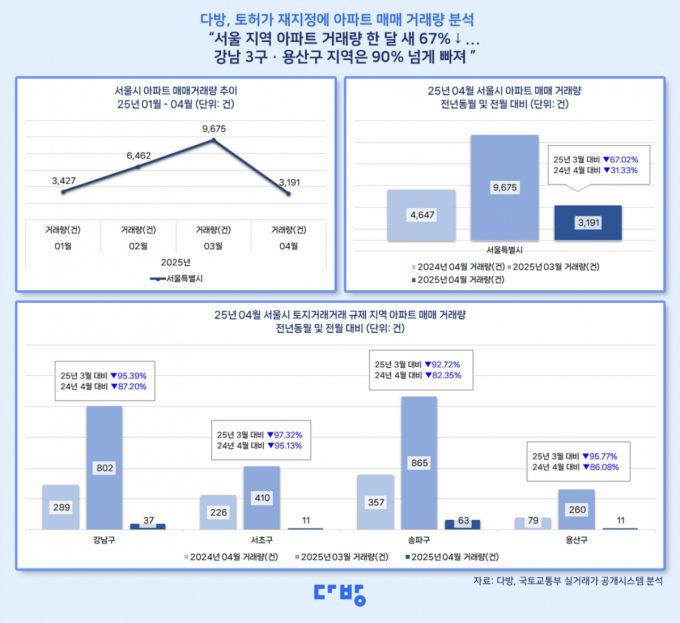 8일 부동산 정보 플랫폼 '다방'이 국토교통부 실거래가를 기반으로 최근 1년 치 서울 아파트 매매 거래량을 분석한 결과에 따르면, 서울 지역 아파트 거래량은 지난 1월 3427건에서 2월 6462건, 3월 9675건으로 지속적으로 증가세를 보였으나, 4월 3191건으로 크게 감소한 것으로 나타났다. 올해 4월 거래량은 전월 대비 67%, 지난해 같은 기간보다 31% 감소한 수치다.