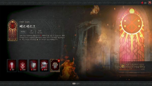인게임 플레이로 얻을 수 있는 무료 보상도 준비됐다. 정예 적을 처치하면 확률에 따라 '베헤리트'를 드롭한다. 베헤리트는 베르세르크 이벤트 성물함에서 묘비 '예견된 일식', 탈것 노획품 '해골 기사의 문장', 등 장식품 '매의 운명' 등 다양한 치장 아이템과 교환 가능하다.