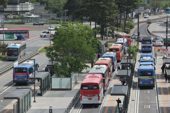 한국노총 전국자동차노조연맹은 8일 전국 대표자회의를 열고 서울, 부산, 인천, 경기 등 22개 지역 전국자동차노동조합연맹 산하 시내버스 노조 노사교섭 결렬 시 오는 28일 동시 총파업을 예고했다. 사진은 8일 서울역 앞 버스환승센터 정류장. 연합뉴스 |