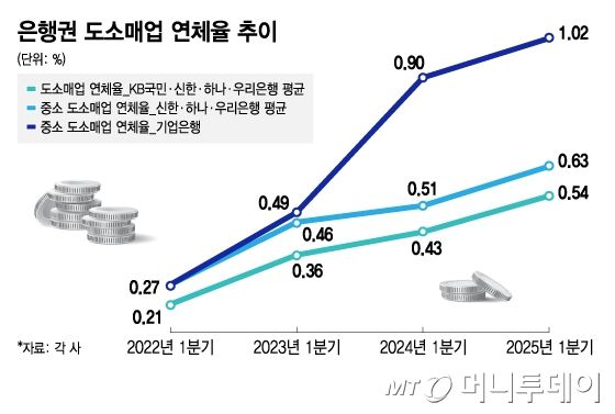중소 도소매업체 연체율 상승폭은 더 가팔랐다. 같은 기간 신한·하나·우리은행 3개 은행의 중소 도소매업 대출 연체율은 0.27%에서 0.63%로 확대됐다. 중소기업 비중이 80%에 달하는 기업은행의 도소매업 연체율은 1.02%에 이른다. 일시적인 등락이 아니라 연속적인 오름세였다.