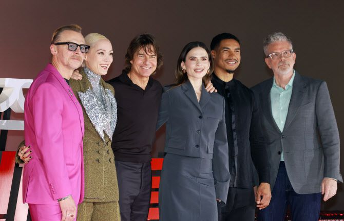 할리우드 배우 사이먼 페그(왼쪽부터), 폼 크레멘티에프, 톰 크루즈, 헤일리 앳웰, 그렉 타잔 데이비스, 스티브 맥쿼리 감독이 8일 오후 서울 송파구 올림픽로 롯데시네마 월드타워점에서 열린 영화 ‘미션 임파서블: 파이널 레코닝’ 기자간담회에 참석해 포즈를 취하고 있다. (사진=뉴스1)