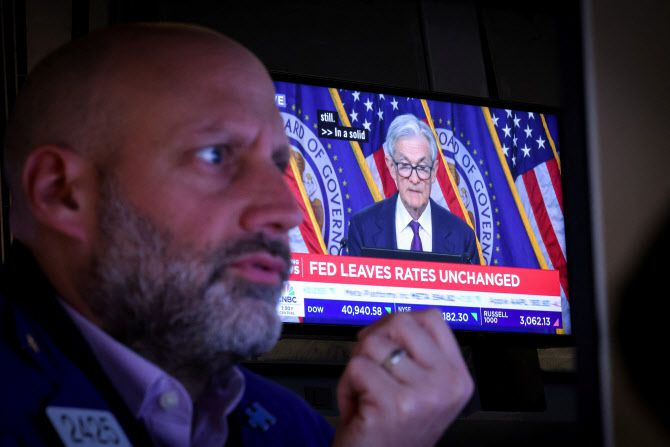 7일(현지시간) 미국 뉴욕의 뉴욕증권거래소(NYSE)에서 연준 금리 발표 후 제롬 파월 미국 연방준비제도 의장의 기자회견이 화면으로 중계되는 가운데 한 트레이더가 일하고 있다.(사진=로이터) |