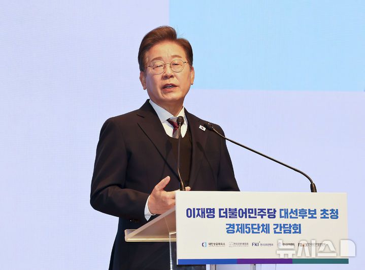 [서울=뉴시스] 국회사진기자단 = 이재명 더불어민주당 대선 후보가 8일 서울 중구 대한상공회의소에서 열린 대선 후보 초청 경제5단체장 간담회에서 발언하고 있다. 2025.05.08. photo@newsis.com