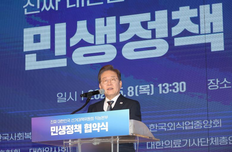 더불어민주당 이재명 대선 후보가 8일 서울 여의도 중소기업중앙회에서 열린 '진짜 대한민국 선거대책위원회' 직능본부 민생정책 협약식에서 발언하고 있다. /연합뉴스 |