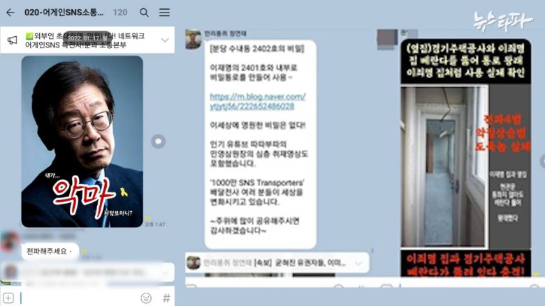 일례로 닉네임 수호천사뽀미 이분희라는 네트워크어게인 간부가 이재명 후보의 얼굴에 ‘내가 악마처럼 보이니’라고 적은 이미지를 올리고 “전파해달라”고 하자, 각 번호 방으로 이미지가 공유됐고 이후엔 페이스북 등 외부 SNS로 퍼져나갔다.