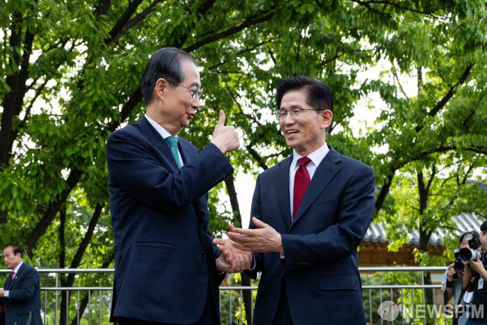 [서울=뉴스핌] 최지환 기자 = 김문수 국민의힘 대선 후보와 한덕수 예비후보가 8일 오후 국회 사랑재 카페에서 공개회동을 하고 있다. 2025.05.08 choipix16@newspim.com