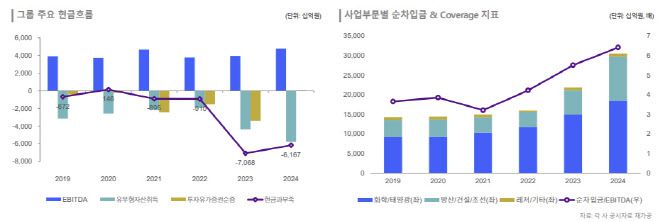 류 연구원은 사업 확장으로 인한 재무부담을 감안해 현금창출력과 투자자금 소요 사이의 균형을 점검할 필요가 있다고 조언했다. 류 연구원은 “M&A, 신사업 투자, 기존사업 CAPEX 지출이 지속되며 그룹 합산 차입금이 큰 폭으로 증가했다”며 “재무부담은 적절히 통제할 수 있지만 예정된 투자 규모가 상당해 그룹 차입 부담이 빠르게 완화되긴 어렵다”고 했다.
