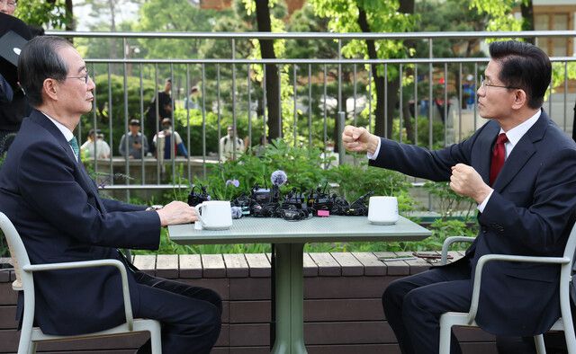 김문수 국민의힘 대통령 후보(오른쪽)와 한덕수 무소속 예비후보가 8일 서울 여의도 국회 강변서재에서 후보 단일화 관련 공개 회동을 하고 있다. 공동취재사진 |