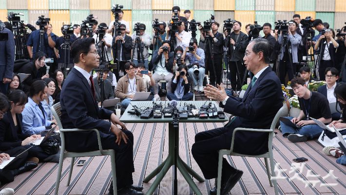 국민의힘 김문수 대선후보와 무소속 한덕수 대선 예비후보가 8일 서울 여의도 국회에서 후보 단일화와 관련해 회동하고 있다. 황진환 기자