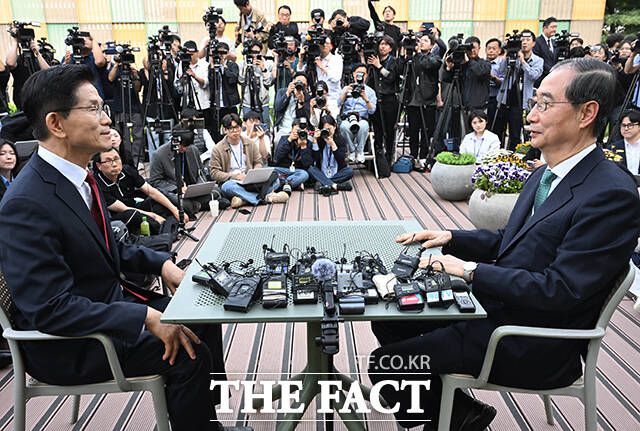 국민의힘 김문수 대선 후보와 무소속 한덕수 예비후보가 8일 서울 국회 사랑재에 위치한 커피숍에서 대화를 나누고 있다. /국회=배정한 기자 |