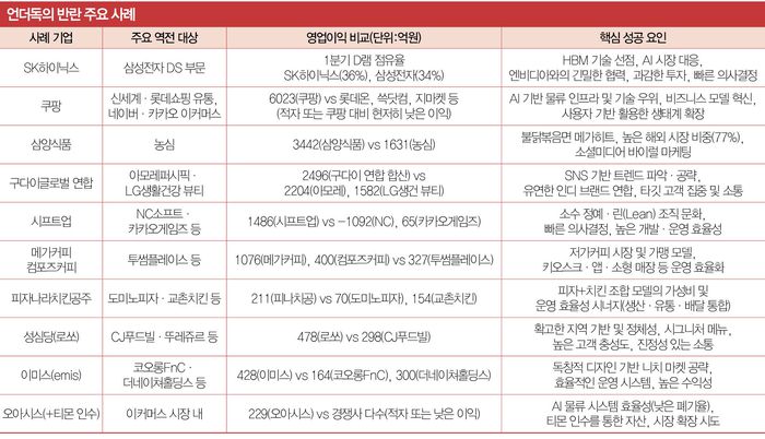 더불어 언더독의 가장 큰 무기는 ‘민첩성’이다. 대기업이 ‘규모의 저주’나 ‘대기업병’이라 불리는 관료주의와 의사결정 지연으로 변화 대응에 둔감한 사이 언더독은 빠른 판단과 실행으로 기회를 포착한다. SK하이닉스가 HBM 시장에서 삼성전자를 앞선 것은 데이비드 티스 캘리포니아대 교수가 강조한 ‘동태적 역량’, 즉 시장 변화에 맞춰 자원을 신속히 재구성하는 능력의 중요성을 극명하게 보여준다.