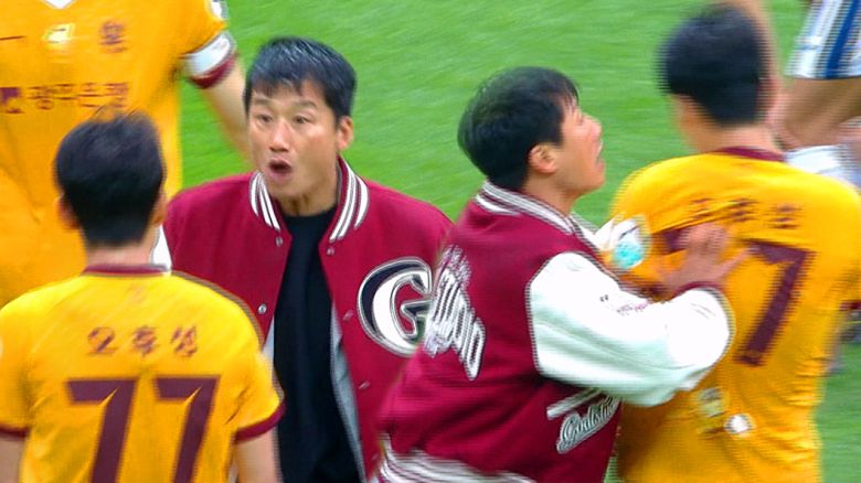 그라운드로 들어가선 미드필더 오후성을 질책하면서 팔을 잡아 당기고 또 밀칩니다.