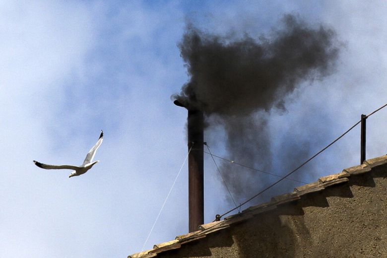 8일(현지시각) 오전 새로운 교황을 뽑기 위해 추기경단이 모여있는 이탈리아 바티칸 시스티나 경당 위 굴뚝에서 검은 연기가 피어올랐다. 교황을 건출하지 못했다는 의미다. EPA 연합뉴스