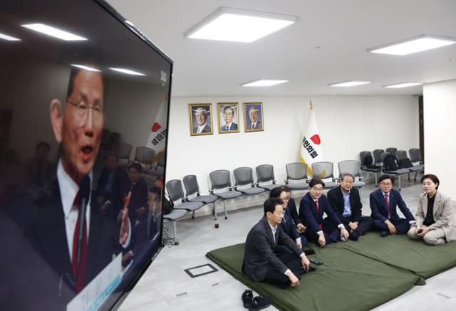 김문수 국민의힘 대선 후보의 단일화 약속 준수를 요구하며 단식을 시작한 권성동 원내대표와 김무성, 류준상 상임고문 등이 8일 서울 여의도 중앙당사에서 김 후보의 관훈토론회 생중계를 보고 있다. 뉴스1 |