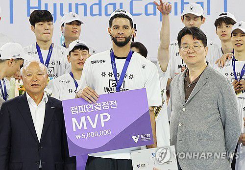 MVP 선정된 현대캐피탈 레오(인천=연합뉴스) 임순석 기자 = 5일 인천 계양체육관에서 열린 2024-2025 V리그 남자부 챔피언결정전 대한항공 점보스와 현대캐피탈 스카이워커스의 3차전 경기. MVP로 선정된 현대캐피탈 레오가 경기가 끝난 뒤 진행된 시상식에서 기념 촬영을 하고 있다. 2025.4.5 soonseok02@yna.co.kr