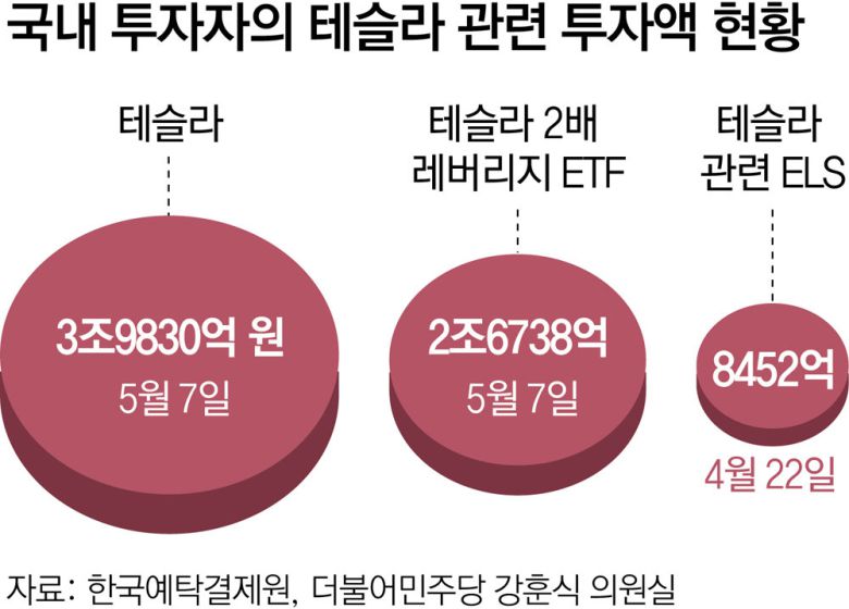 국내 투자자들의 테슬라 주식 보유 금액도 6일 기준 188억4143만 달러로, 지난해 같은 기간(111억1381만 달러)보다 70억 달러 넘게 늘었다. 강훈식 더불어민주당 의원에 따르면 지난달 말까지 국내 금융기관은 8452억 원 규모의 테슬라 주가를 기초자산으로 하는 주가연계증권(ELS) 상품을 보유한 것으로 나타났다.