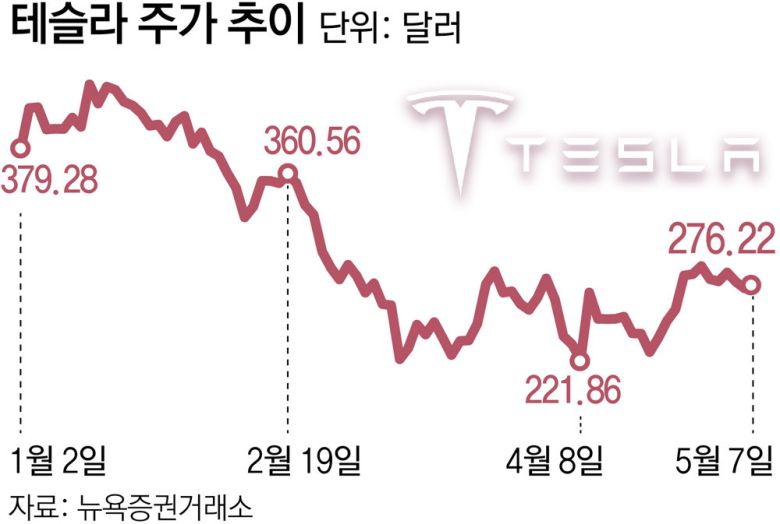 주가 하락이 이어지는 데다 최근 원-달러 환율 급락으로 환 손실 위험까지 커지면서 국내 투자자들의 불안감도 커지고 있다. 하장권 현대차증권 연구원은 “테슬라의 주가가 400달러를 넘은 것은 미 대선 때 정치 테마주로 엮였던 영향이 있는 만큼 단기에 고점을 회복하긴 어려울 것”이라며 “전기차 관련 매출이 살아나기 전까지는 횡보세를 보일 가능성이 크다”고 말했다.