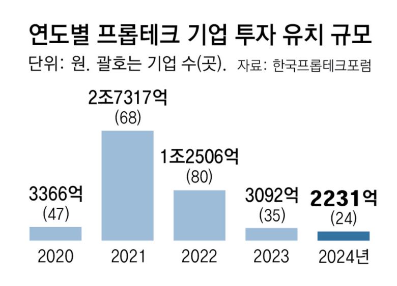 이날 한국프롭테크포럼에 따르면 지난해 프롭테크 기업들의 투자 유치 금액은 2231억 원으로 전년(3092억 원)보다 27.8% 줄어든 것으로 집계됐다. 투자 유치 금액이 정점을 찍었던 2021년(2조7317억 원)과 비교하면 8.2% 수준으로 감소한 것이다. 투자를 유치한 기업 수도 크게 줄었다. 2022년 80곳이던 기업 수는 2023년 35곳, 2024년 24곳으로 2년 연속 감소했다.