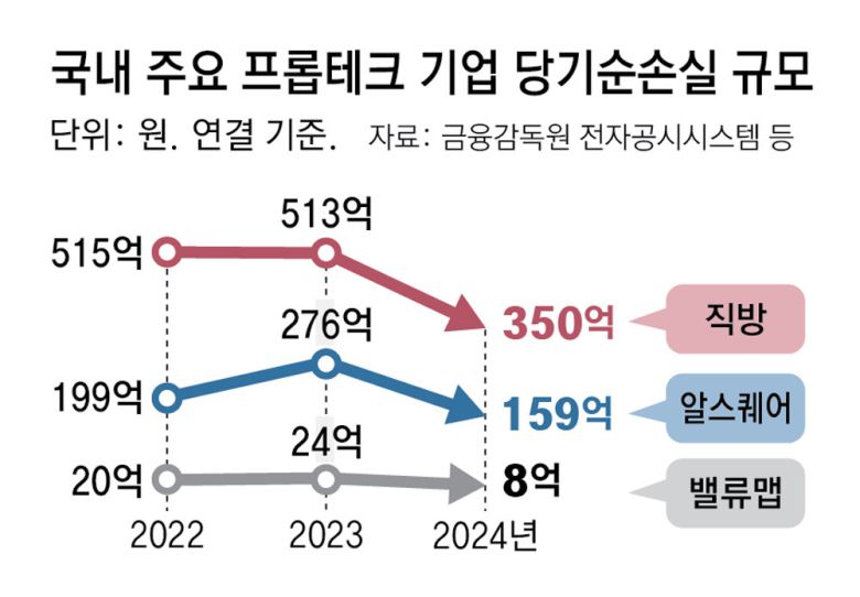 부동산 상업용 플랫폼 기업인 알스퀘어는 지난해 영업손실 144억 원으로 2022년 이후 3년 연속 적자를 내고 있다. 알스퀘어도 2021년 이후 추가 투자를 받지 못하고 있다. 토지·빌딩·상가 거래 플랫폼 디스코는 3년 연속 자산보다 부채가 더 커졌다. 인공지능 건축설계·감정평가 서비스를 제공하는 밸류맵은 지난해 자본 규모가 551만 원으로 2년 전(32억2954만 원) 대비 2%대로 쪼그라들어 자본 잠식 우려가 나오고 있다.