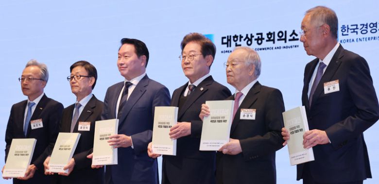 이재명 더불어민주당 대선 후보(왼쪽에서 네 번째)가 8일 서울 중구 대한상공회의소에서 열린 경제 5단체장 간담회에 참석해 정책제언집을 들고 기념사진을 찍고 있다. 왼쪽부터 최진식 한국중견기업연합회 회장, 윤진식 한국무역협회 회장, 최태원 대한상공회의소 회장, 이 후보, 손경식 한국경영자총협회 회장, 류진 한국경제인협회 회장. 사진공동취재단 |