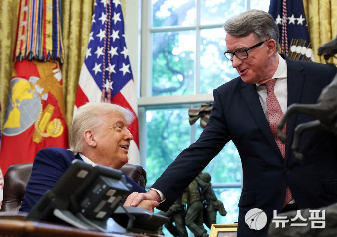 도널드 트럼프 미국 대통령이 8일(현지시간) 워싱턴 D.C. 백악관 오벌 오피스에서 영국과의 무역 합의 체결을 발표한 뒤, 피터 맨델슨 주미 영국 대사와 악수를 나누고 있다.[사진=로이터 뉴스핌] 2025.05.09 mj72284@newspim.com |