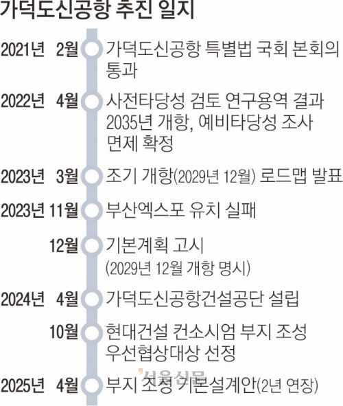 이런 상황이 벌어지면서 2029년 개항은 애초에 무리였다는 지적이 나온다. 2022년 사전타당성조사에서는 부등침하 우려 등으로 완전 해상공항 형태로 9년 8개월간의 공사를 거쳐 2035년 개항하는 계획이 제시됐다. 그러나 2023년 12월 고시한 기본계획에서는 개항이 2029년 12월로 5년 당겨졌다. 당시에는 부산의 엑스포 유치를 위해 개항 시점을 당겼는데 지금은 그럴 이유가 없다는 것이다.