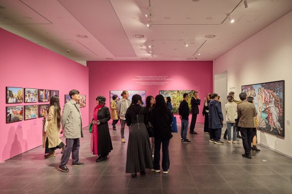 서울 중구문화재단이 운영하는 충무아트센터 갤러리에서 지난달 22일부터 진행 중인 전시 ‘더 글로리어스 월드’를 보러 온 관람객들이 행사장에 마련된 110여점의 작품을 살펴보고 있다. 중구문화재단 제공