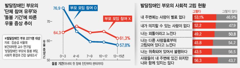 김승섭 서울대 교수가 이끈 장애와 건강 연구팀(김자영·김지환·팽은지)이 지난해 12월 발달장애인 부모 2271명을 대상으로 진행한 ‘발달장애인 부모의 돌봄부담, 사회적 환경과 건강 실태조사’(실태조사)를 8일 보면, 부모 모임에 참여하는 엄마의 우울 증상은 돌봄 기간이 늘어날수록 큰 폭으로 나아지는 모습이 나타났다. 참여하지 않는 부모의 우울 증상이 큰 변화를 보이지 않는 것과 대조적이다. ‘최근 1년 동안 자살을 진지하게 생각해 봤다’는 비중이 28.5%에 이를 정도로 극도의 우울을 겪는 발달장애인 부모에게 만남과 연대, 사회 변화를 촉구하는 경험이 버팀목이 될 수 있는 셈이다. ‘사회적 소수자가 모인다’는 것의 의미를 보여주는 조사 결과는, 이들에게 사회적 고립 상태를 해소하는 것이 얼마나 절박한 문제인지 또한 드러낸다.