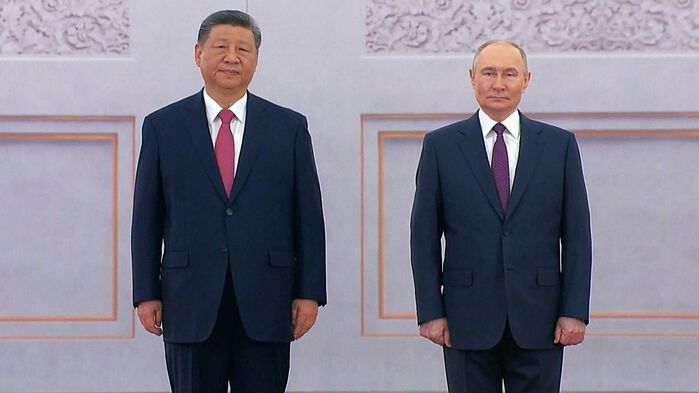 크렘린궁에 깔린 붉은 카펫 한가운데서 만난 시진핑 중국 국가주석과 푸틴 러시아 대통령은 환하게 웃으며 손을 맞잡았습니다.