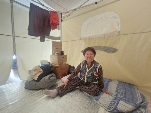 44일째 임시 거처 텐트에서 생활 중인 금영자 할머니 |