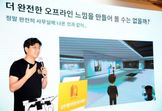 안성우 직방 대표가 2021년 서울 성동구의 한 스튜디오에서 ‘직방 10주년 미디어데이’를 개최해 ‘메타폴리스’를 발표했다. / 사진제공=직방 |