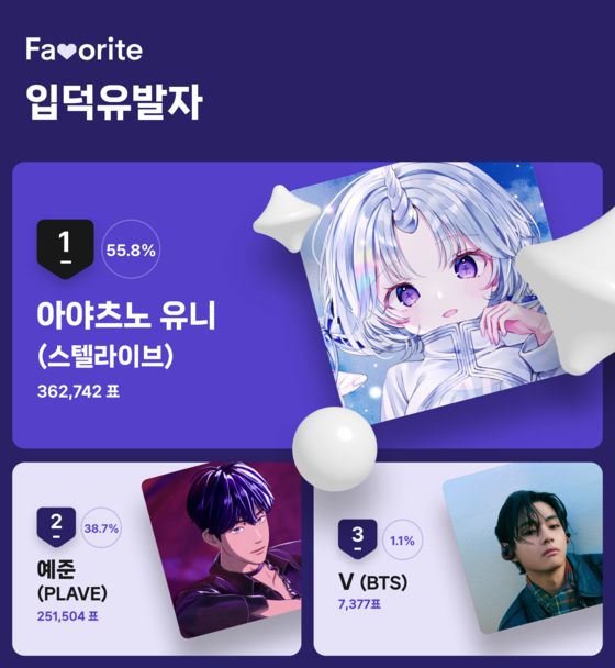 3위는 팬 투표 7377표로 총 1.1%의 지지를 받은 방탄소년단(BTS)의 뷔(V)가 차지했다.
