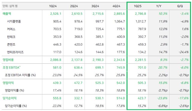 커머스는 분기 기준 전년 동기 대비 12% 성장했다. 네이버플러스 스토어 앱 출시, N배송 개편, 멤버십 혜택 강화 등이 주효했다. 1분기 스마트스토어와 서비스 거래액 증가로 네이버 커머스의 온-플랫폼 거래액이 이 기간 10.1% 증가했다. 커머스 광고 매출은 네이버플러스 스토어 출시 및 지면 최적화, 추천광고 고도화 등의 영향으로 역대 최대 규모를 달성했다.