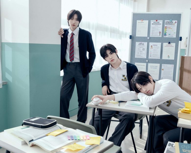 7명 멤버들은 단정한 스쿨룩을 소화했다. 교실에 나란히 앉거나 벽에 기대어 포즈를 취했다. 교과서와 필기구 등 다양한 소품들로 하이틴 감성을 완성했다.
