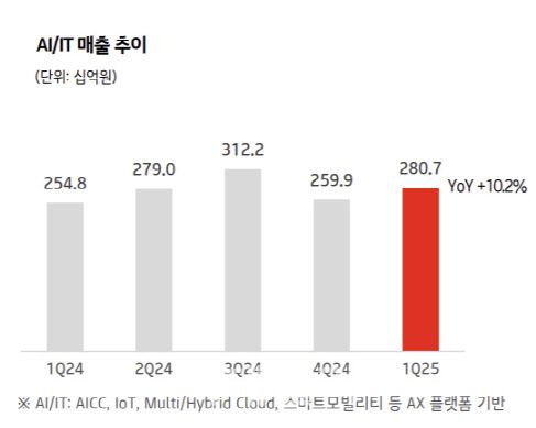 기업서비스 매출은 기업인터넷?데이터사업과 AI·IT 사업 성장에도 저수익 사업 합리화 영향으로 전년 동기 대비 0.3% 감소했다. KT는 AICT 전략방향에 맞춰 AI·IT 사업을 집중 육성하고 있으며, AICC 및 IT 구축형 사업의 성장에 힘입어 관련 매출이 전년 동기 대비 10.2% 증가하며 높은 성장세를 이어가고 있다.