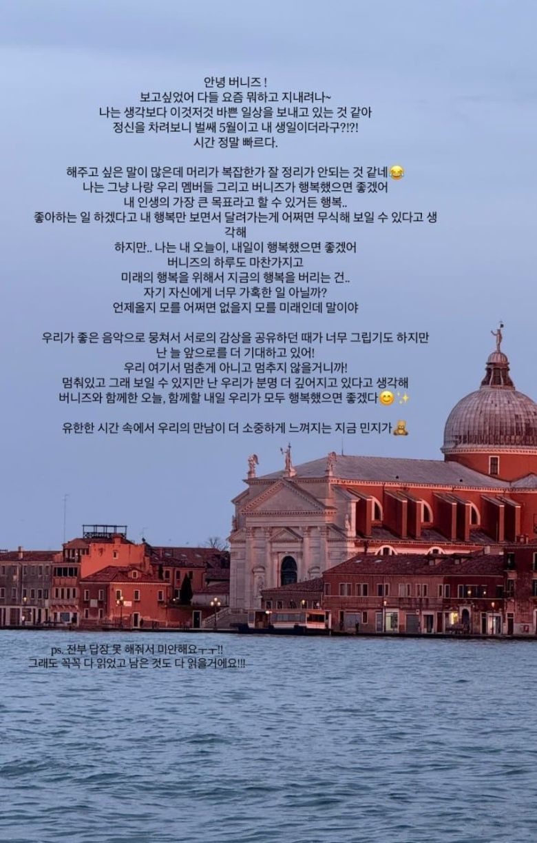 버니즈(팬덤명)에 근황을 전했다. "난 생각보다 바쁜 일상을 보내고 있다"며 "정신 차려보니 내 생일이다. 시간 정말 빠르다"고 했다.