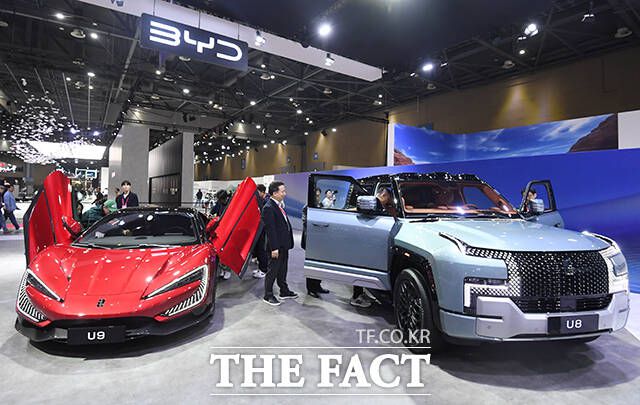 9일 한국수입자동차협회(KAIDA)에 따르면 BYD는 4월 '아토3' 543대를 등록하며 전기차 모델 중 가장 높은 판매량을 기록했다. 테슬라 '모델Y' 롱레인지는 533대로 그 뒤를 이었다. 지난달 3일 경기 고양시 킨텍스에서 열린 '2025 서울모빌리티쇼 미디어데이' 행사에서 BYD 차량들이 전시돼 있는 모습. /장윤석 기자 |