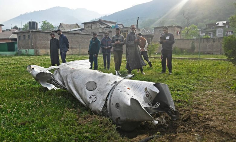 2025년 5월 7일, 카슈미르의 스리나가르 인근 우얀에서 주민들이 항공기의 잔해를 살펴보고 있다. AFP 연합뉴스