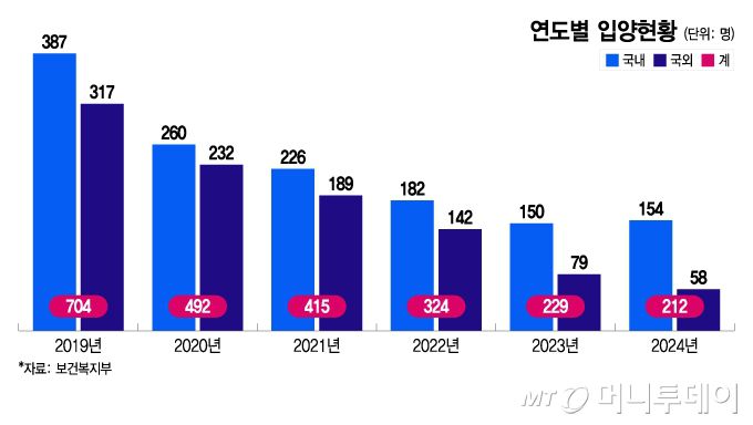 9일 보건복지부에 따르면 지난해 법원이 허가한 총 입양자는 212명이며, 국내 입양은 154명, 국외 입양은 58명이었다. 국내입양은 전년 대비 4명이 늘고, 국외입양은 21명이 줄었다.