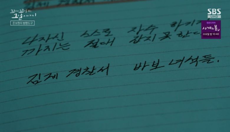 본인은 총 6건의 범행을 저질렀는데, 공개수배에 단 3건의 혐의만 언급됐다는 거야. 게다가 세상은 여전히 지존파 사건으로 떠들썩해. 그걸 보면서 온보현이 자수를 결심했다는 거야. 온보현은 수첩을 꺼내 그간의 범행 과정을 적기 시작했어. 그게 바로 이 범행일지야. 사건이 있던 날마다 그때그때 기록을 한 게 아니라, 완전히 급조된 범행일지야. 그는 자신의 범행을 제대로 알리기 위해 범행일지를 쓰고, 자수를 했다고 주장했어. 하지만 전문가의 분석은 달라.