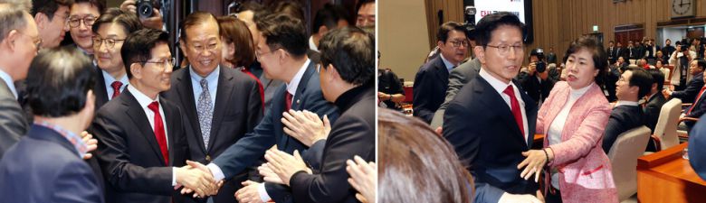 김문수 국민의힘 대통령 후보가 9일 서울 여의도 국회에서 열린 후보 선출 뒤 처음으로 의원총회에 입장하며 박수를 받고 있다.(왼쪽사진) 김 후보가 단일화를 거부하는 발언 뒤 의총장을 나서자 조배숙 의원이 가로막고 있다.김경호 선임기자 jijae@hani.co.kr |